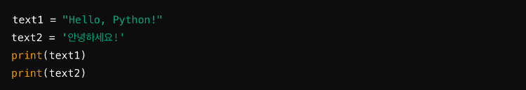 문자열은 문자들의 집합으로, 작은따옴표(') 또는 큰따옴표(")로 감싸서 표현한다.